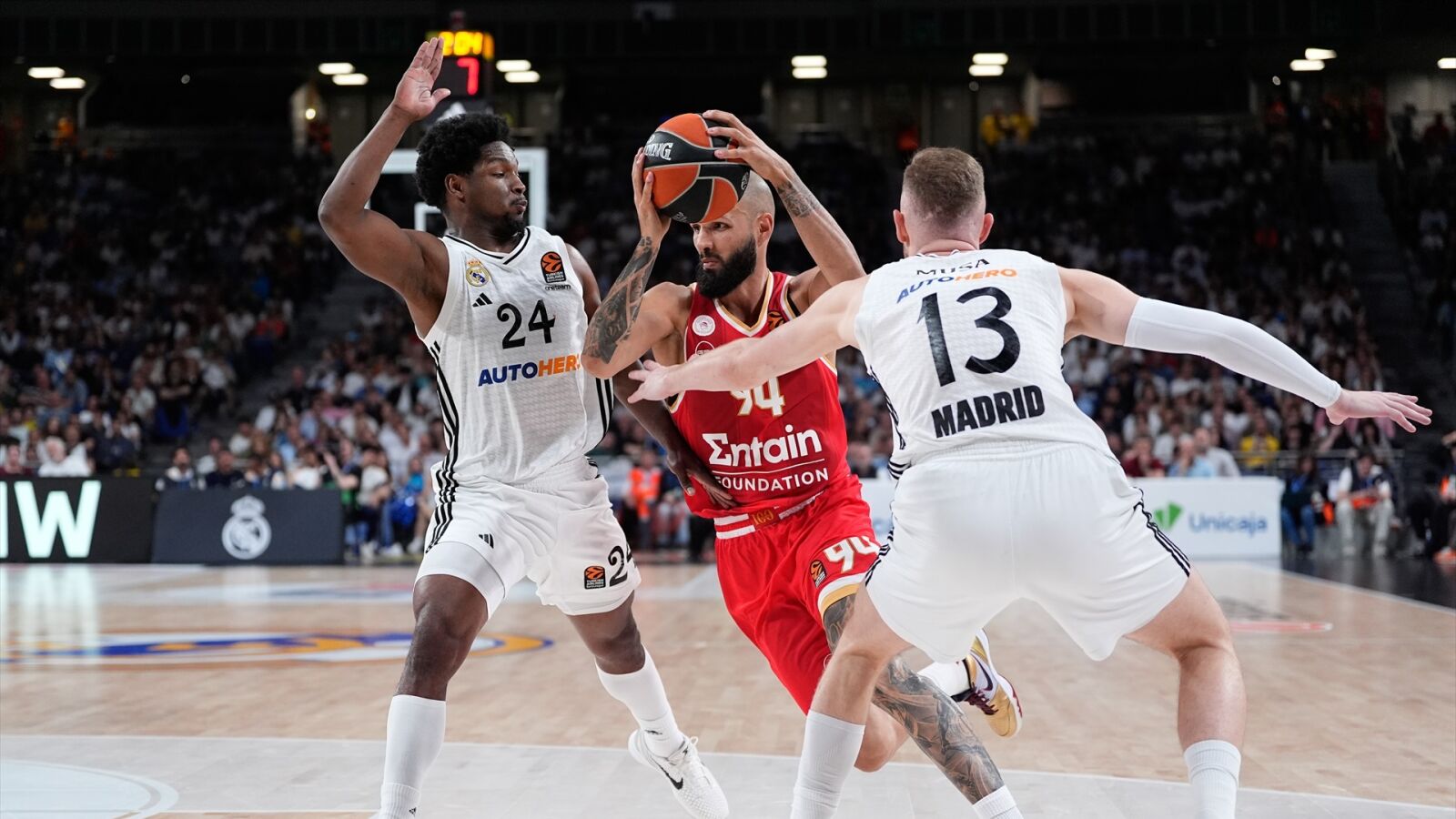 Con el triple sin bajar el nivel (8/14) y con el equipo de El Pireo algo enredado en las pérdidas, el conjunto madridista lanzó otro golpe tras un acierto de tres de Hezonja (43-34), bien sujetado por Alec Peters (9 puntos) y Fournier (14) para mantener al Olympiacos al acecho al descanso (47-42). La peor noticia para Mateo eran las tres faltas de Walter Tavares y las dos de Bruno Fernando, su sustituto natural.