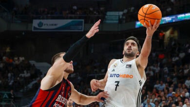En la vuelta al parqué, cinco puntos seguidos de Timothé Luwawu-Cabarrot volvieron a romper ligeramente el enfrentamiento ante un rival atenazado que no lograba darle velocidad a su juego, y mucho menos encadenar minutos de inspiración que le permitiesen llegar con confianza al tramo final. No hizo el Baskonia, sin embargo, tanto daño como pudo cuando debió. Y lo acabó pagando. Tras anotar sólo un punto en seis minutos, entre el desenlace del tercer acto y el inicio del cuarto, cavó su tumba. Sin alardes, pero impulsado por la tranquilidad de ver a su oponente nublado, acabó despegando el equipo anfitrión. La electricidad de Andrés Feliz y el buen hacer de Sergio Llull comenzaron a decantar la contienda, situando a los suyos con siete de renta favorable a falta de seis minutos. Quedaba rematarlo. Y no lo puso fácil el renacido bando vitoriano, que llegó a ubicarse a cuatro hasta en dos ocasiones, apagando sus esperanzas en ambas sendos triples de Alberto Abalde, sobre la bocina de posesión, y de Facundo Campazzo. Pese a ese querer y no poder hubo una tercera, a falta de 20 segundos y con posesión para meter más miedo. Falló desde el perímetro Luka Samanic y no hubo más espacio para creer.