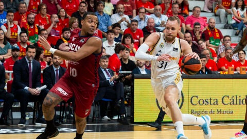 El Real Madrid conquistó este miércoles en Murcia su trigésimo séptimo título de la Liga Endesa de baloncesto al vencer a un luchador UCAM también en la capital del Segura por 73-84 y ese triunfo se unió a los que había obtenido antes en el WiZink Center (84-76 y 79-63). Los de Chus Mateo decantaron la balanza en un gran tercer cuarto por su parte y Dzanan Musa fue elegido MVP de la final.