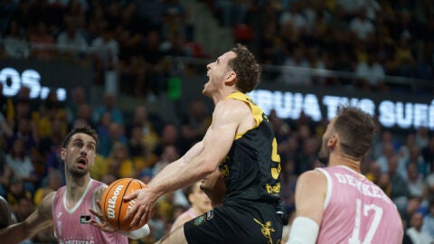 Tomic también apareció en el choque. Dominaba el rebote en su canasta y aportaba lo que podía en ataque para poner un ajustado 33-28 antes de que Dekker lograra anotar una importante canasta de tres puntos, no solo para acercar a su equipo en el marcador, sino para dar confianza al juego de ataque e intentar cambiar la dinámica ofensiva del equipo. El partido volvió a igualarse al descanso (42-41) tras sendos triples de Hanga y Kramer y en el inicio de tercer cuarto hubo intercambios de canastas hasta que, primero Dekker y luego Hanga, cada uno con un triple, y luego Pustuvyi, con dos tiros libres, pusieron a su equipo con ventaja en el marcador (46-53), la máxima por parte del equipo visitante y encendieron las alarmas en el banquillo canario.