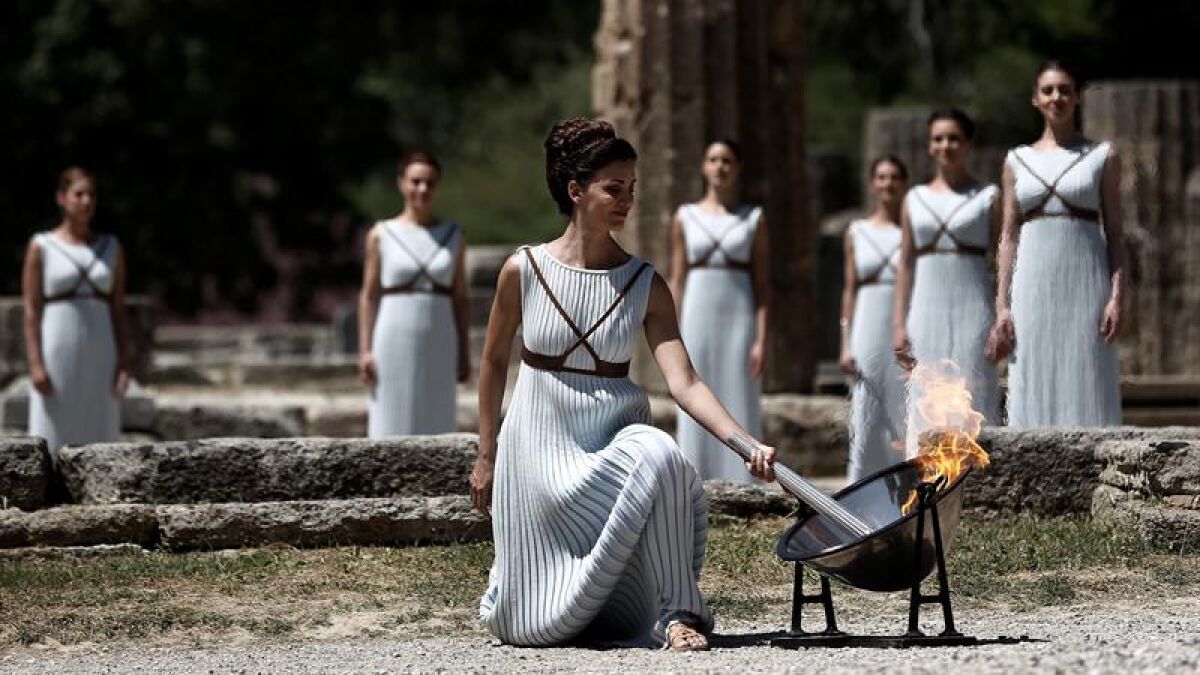 Rodeada de una coreografía onírica, la actriz Katerina Lehú en su papel de Gran Sacerdotisa de Olimpia, rodeada de otras sacerdotisas y vírgenes vestales, encendió la llama utilizando un espejo parabólico que desvía y concentra los rayos del sol.