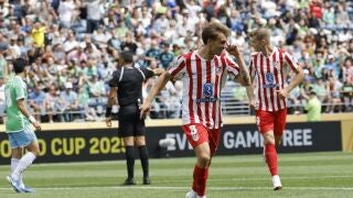 Solo un minuto después llegó el 1-0, con un pelotazo de Pablo Barrios desde la frontal del área tras una asistencia de Giuliano Simeone, quien había conducido el contragolpe por la banda derecha. Sorloth tuvo el segundo en el minuto 15, pero tras un gran control con el pecho dentro del área, a centro de De Paul, su remate se fue a las nubes. El peor susto para el Atleti llegó dos minutos después, cuando José María Giménez despejó mal un centro del Seattle sin percatarse de que tenía a Daniel Musovski justo detrás. El delantero remató a bocajarro, pero Jan Oblak respondió con una gran atajada. Esa acción marcó el inicio de un tramo de dominio del Seattle, que jugaba muy suelto y al ataque pese a los espacios que dejaba atrás.