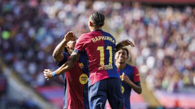 Pese a tanto percance, a Olmo no se le borraba la sonrisa de la cara y eso presagiaba cosas buenas para el Barça. Dicho y hecho, en el 20' abrieron el marcador los locales gracias a un espléndido pase del central Pau Cubarsí desde su propio campo, para el desmarque de Raphinha mientras lo intentaba atrapar Luis Pérez a la carrera.