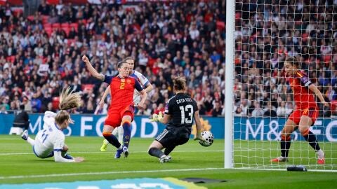 Antes, España contó con dos remates tras saques de esquina, aunque se fueron muy desviados de la meta de Hannah Hampton. Las de Sonia Bermúdez comenzaron a controlar más la posesión y tuvieron más presencia en el centro del campo. Ese dominio no se tradujo en ocasiones, ya que un disparo desviado de Vicky López y otro de Ona Battle no consiguieron ver puerta. En el tiempo añadido de la primera mitad, Alessia Russo, que fue un constante peligro para la defensa española, especialmente para las centrales, se encontró con Cata Coll, que repelió un potente disparo.