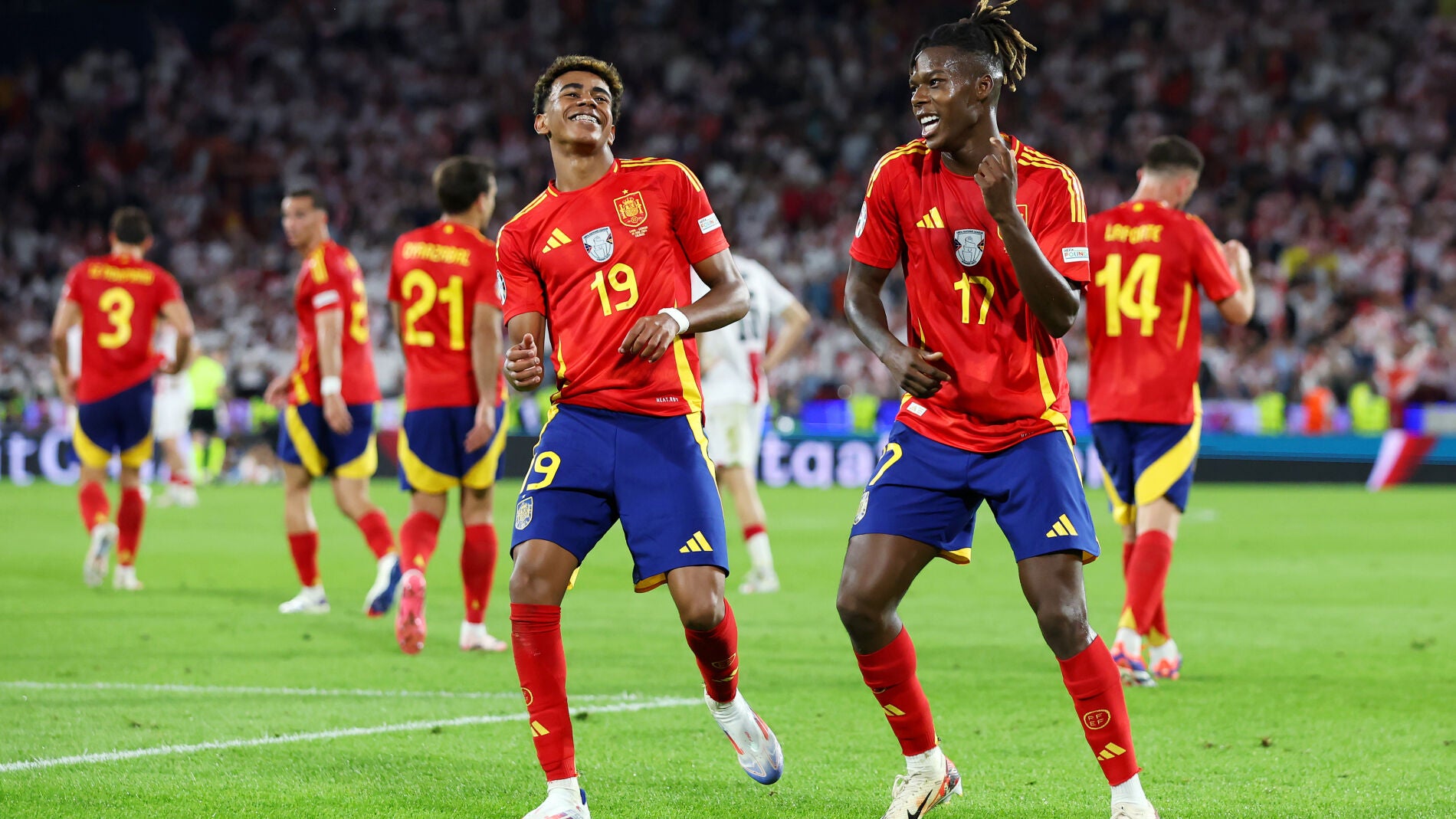 La actual selección española se ha distinguido a lo largo del torneo por la perfecta unión entre jugadores jóvenes y veteranos. Los más destacados del primer grupo son los extremos Lamine Yamal y Nico Williams, quienes han sido dos de los mejores jugadores de España y de la Eurocopa en general. Ambos nacieron y se criaron en España, aunque el origen de sus progenitores es extranjero.