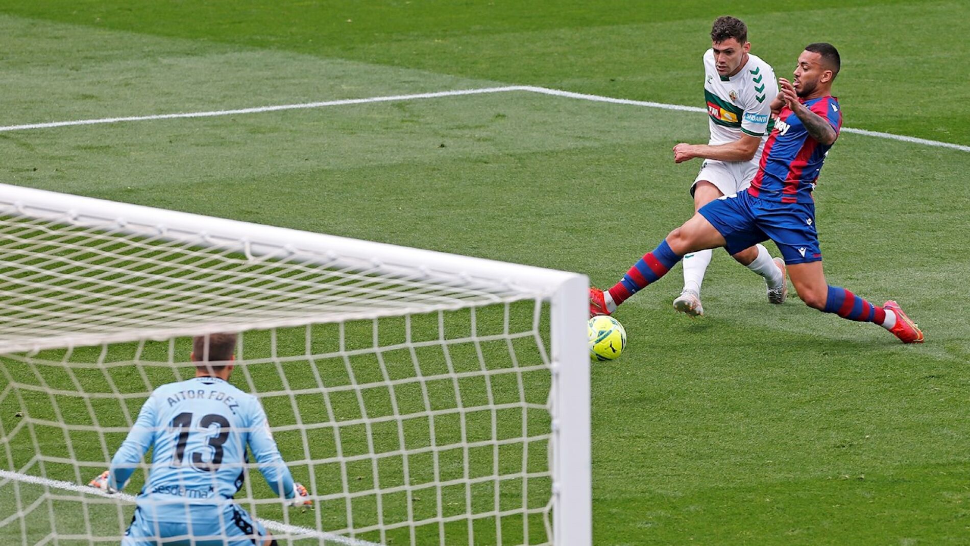 Los ilicitanos han planteado un partido defensivo en el que han cedido la iniciativa al Levante, esperando sus opciones a la contra y en el balón parado. En un error de los valencianos, Lucas Boyé le ha robado la cartera a Vezo tras un resbalón y ha cruzado el balón ante Aitor Fernández. Es el sexto tanto de la temporada para el argentino.