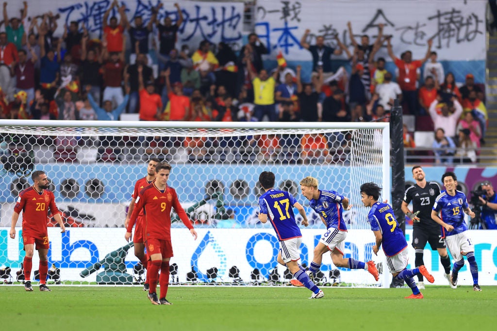 Japón remonta a España en un inicio frenético de la segunda parte con dos goles en tres minutos y termina primera de grupo. España, que estuvo durante unos minutos eliminada por la victoria momentánea de Costa Rica, termina segunda de grupo.