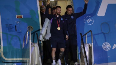 Minutos antes de las 3.00 horas (6.00 GMT), un exultante Messi con el trofeo de campeón del mundo en las manos junto al seleccionador y al dirigente de la AFA fueron los primeros en descender de la aeronave y, poco a poco, fueron bajando el resto de integrantes de la 'Scaloneta'.