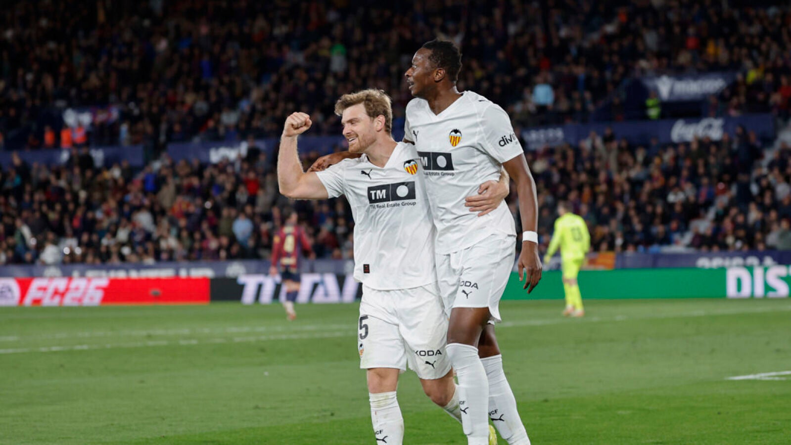 El Levante, más incisivo en las segundas jugadas y buscando un juego más directo, dominaba la posesión y encerraba atrás al Valencia sin crear peligro. El Levante dio un paso adelante tras el descanso y en los primeros cinco minutos gozó de dos nuevas ocasiones. Un cabezazo de Adrián de la Fuente y un disparo de Kareem Tunde acercaron a los locales al gol, pero ambos remates salieron desviados de la portería de Dimitrievski. El entrenador del Valencia, Carlos Corberán, buscó la reacción de su equipo y realizó tres cambios en una ventana reforzando el centro del campo y la delantera con la entrada de Javi Guerra, Guido Rodríguez y Umar Sadiq con más de media hora por delante. Y entre Sadiq y Guerra tejieron la jugada que acabaría en el primer gol del Valencia.