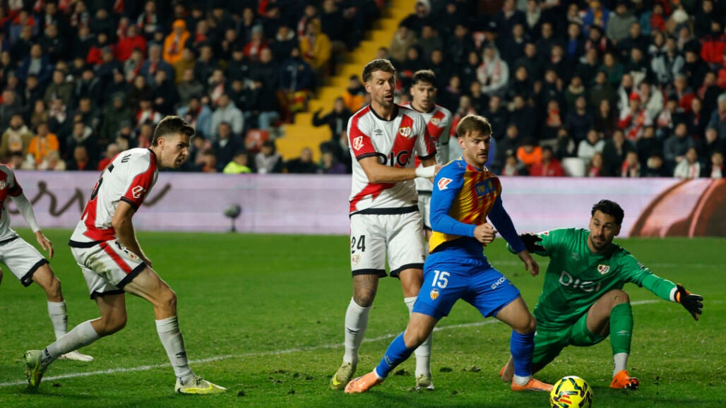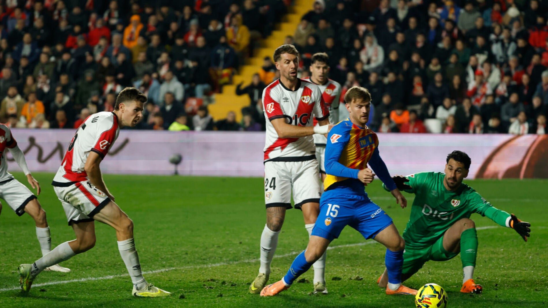El Valencia, en el que destacó en su ataque Hugo Duro, que no era titular en Liga desde el 20 de octubre, propuso poco en la primera parte pero, aun así, pudo llevarse un premio en el tiempo añadido con un remate de Diego López, dentro del área, que se estrelló de espaldas en los pies de Álvaro García. Tras el descanso, el partido siguió al principio por los mismos derroteros, con el Rayo tratando de dominar el juego y llevar la iniciativa ofensiva, gozando de otra oportunidad clara con un disparo potente de Gumbau que despejó Agirrezabala.