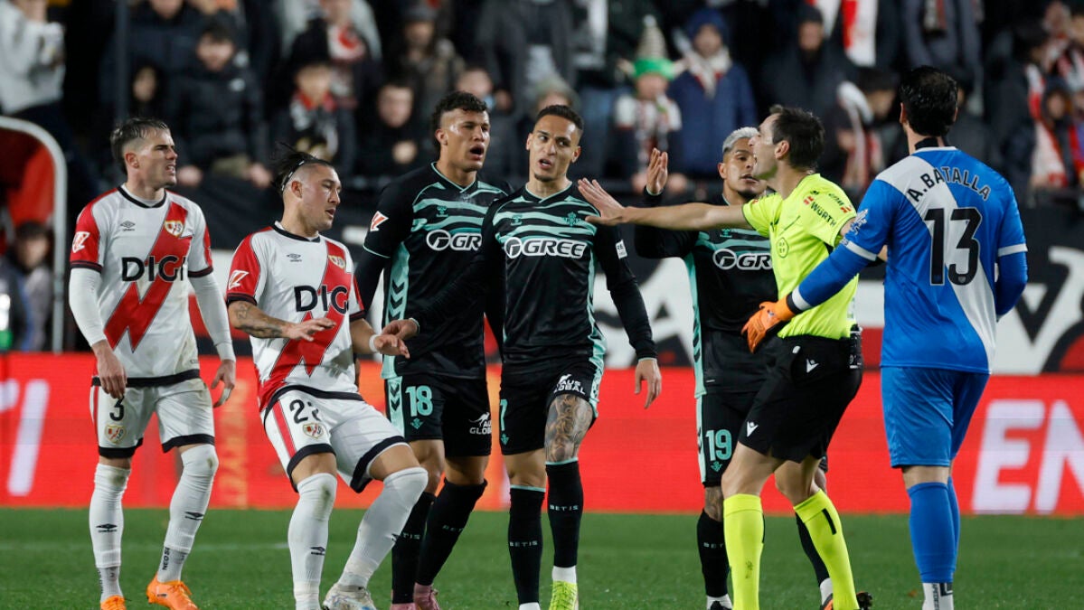 El Rayo, en el que destacó la presencia como extremo izquierdo el uruguayo Luis Alfonso 'Pacha' Espino, no quiso especular con el balón a sabiendas de la calidad del Betis y siempre que pudo trató de trazar jugadas rápidas verticales aprovechando la rapidez de Isi Palazón y Álvaro García. Sin embargo, cuando parecía que el Rayo estaba disfrutando sobre el césped, llegó el sinsabor. Jorge de Frutos, en un mal apoyo de la pierna derecha, se lesionó y pidió el cambio. Entre lágrimas, sin poder apoyar, se marchó acompañado de los médicos al vestuario. Le sustituyó Fran Pérez.