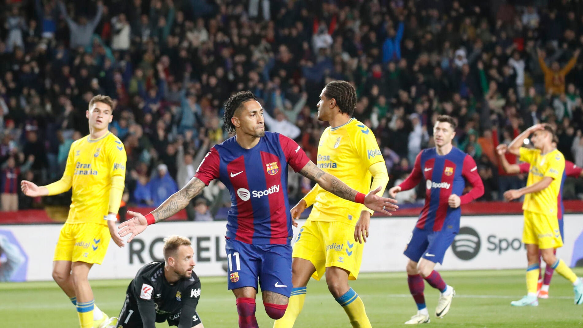 El Barcelona derrotó este sábado a la UD Las Palmas en el partido de LaLiga EA Sports que les enfrentó en el Estadio Olímpico Lluís Companys, gracias a un gol de Raphinha a centro de Joao Félix (1-0) que hizo justicia al dominio del conjunto catalán en el juego.