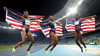 Por su parte, Estados Unidos hizo historia en la prueba de los 100 metros vallas subiendo a tres atletas al podio. El equipo norteamericano, sin la récord del mundo Kendra Harrison, se hizo con los tres metales por medio de Brianna Rollins (12.48), Nia Ali (12.59) y Kristi Castlin (12.61).