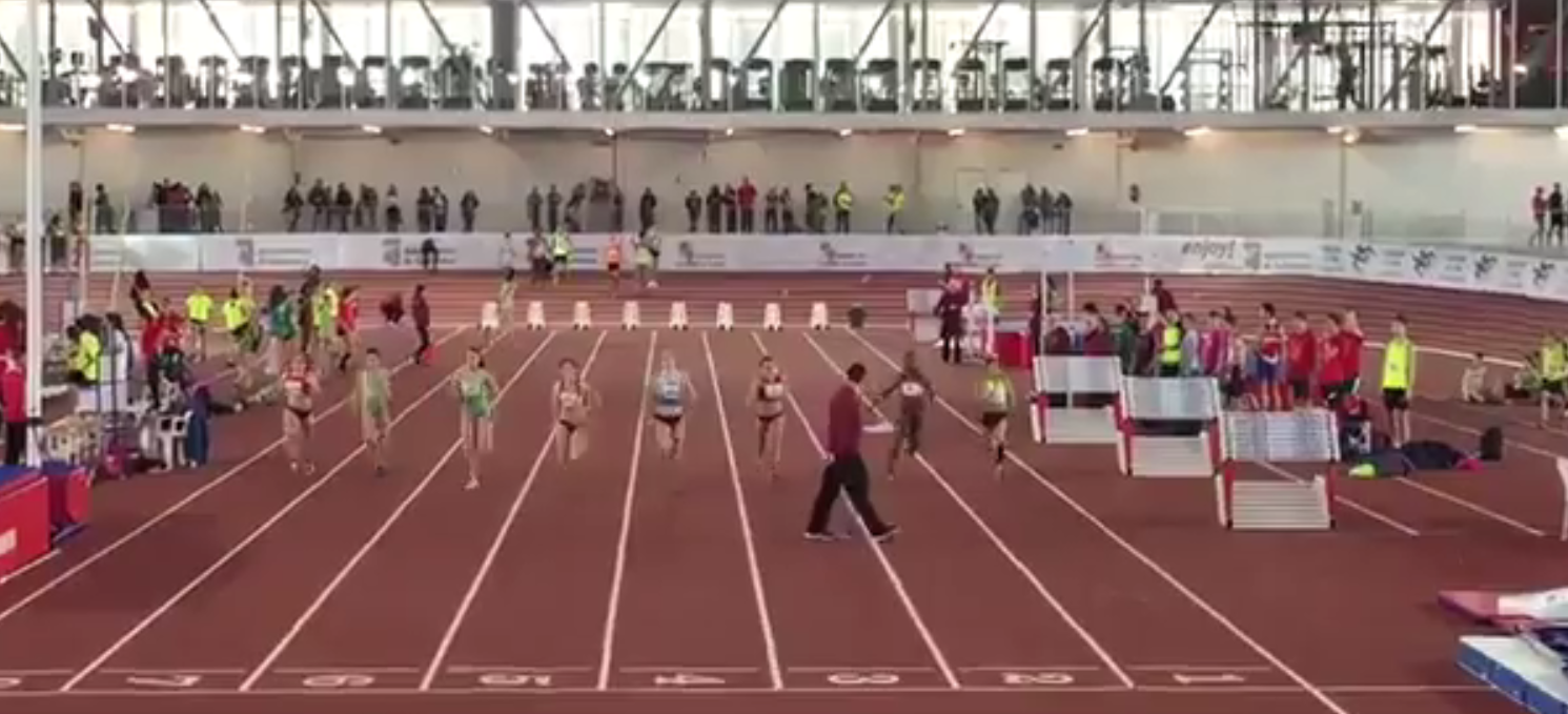 Un juez se mete en una pista de atletismo en plena carrera de 60 metros lisos