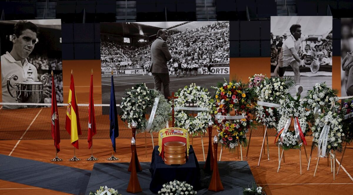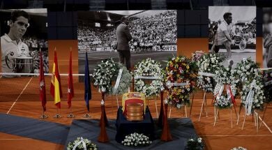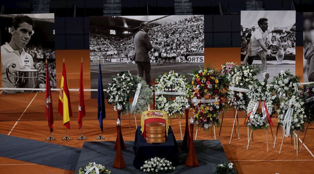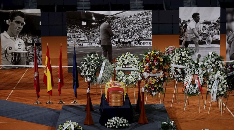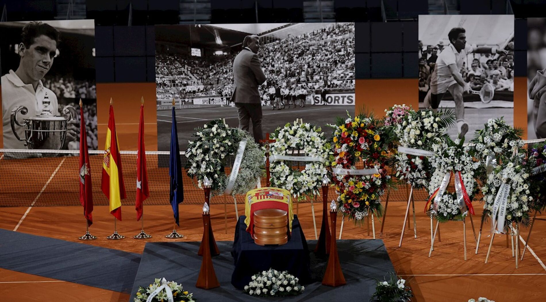 El féretro con los restos mortales del histórico tenista, que fue trasladado el domingo desde Marbella -donde falleció-, está situado en el centro de la pista 'Manuel Santana' que ha sido habilitada para que todo aquel que quiera despedirse pueda acceder y estará abierta hasta las 20:00 horas de hoy.