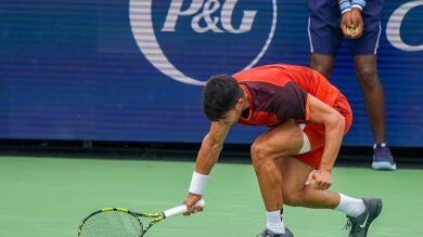 Carlos Alcaraz perdi贸 este viernes su partido ante Monfils y cay贸 eliminado en dieciseisavos del torneo de Cincinnati. El tenista murciano dej贸 una imagen poco habitual mostrando un gran cabreo que le llev贸 a romper su raqueta contra el suelo.