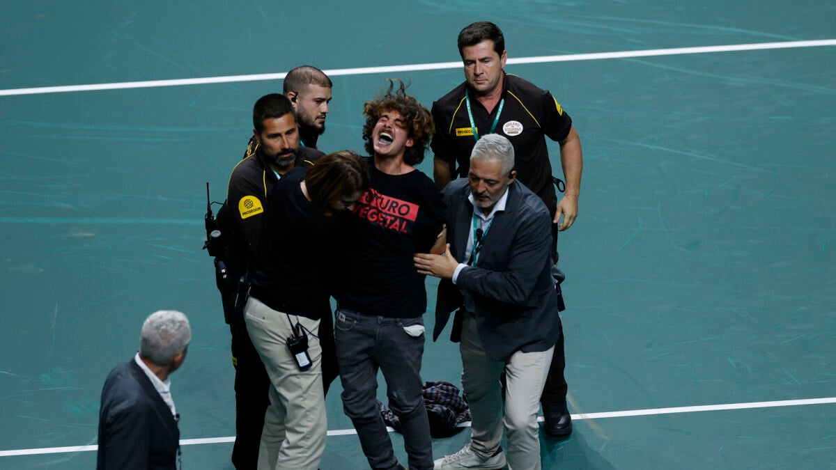 Dos activistas climáticos de "Futuro Vegetal" han interrumpido el partido de cuartos de final de la Copa Davis de tenis que jugaban el español, Roberto Bautista, y el croata, Borna Coric, en Málaga, para pedir cambios en el sistema agroalimentario con el fin de aumentar el consumo de vegetales y reducir el de carne.
