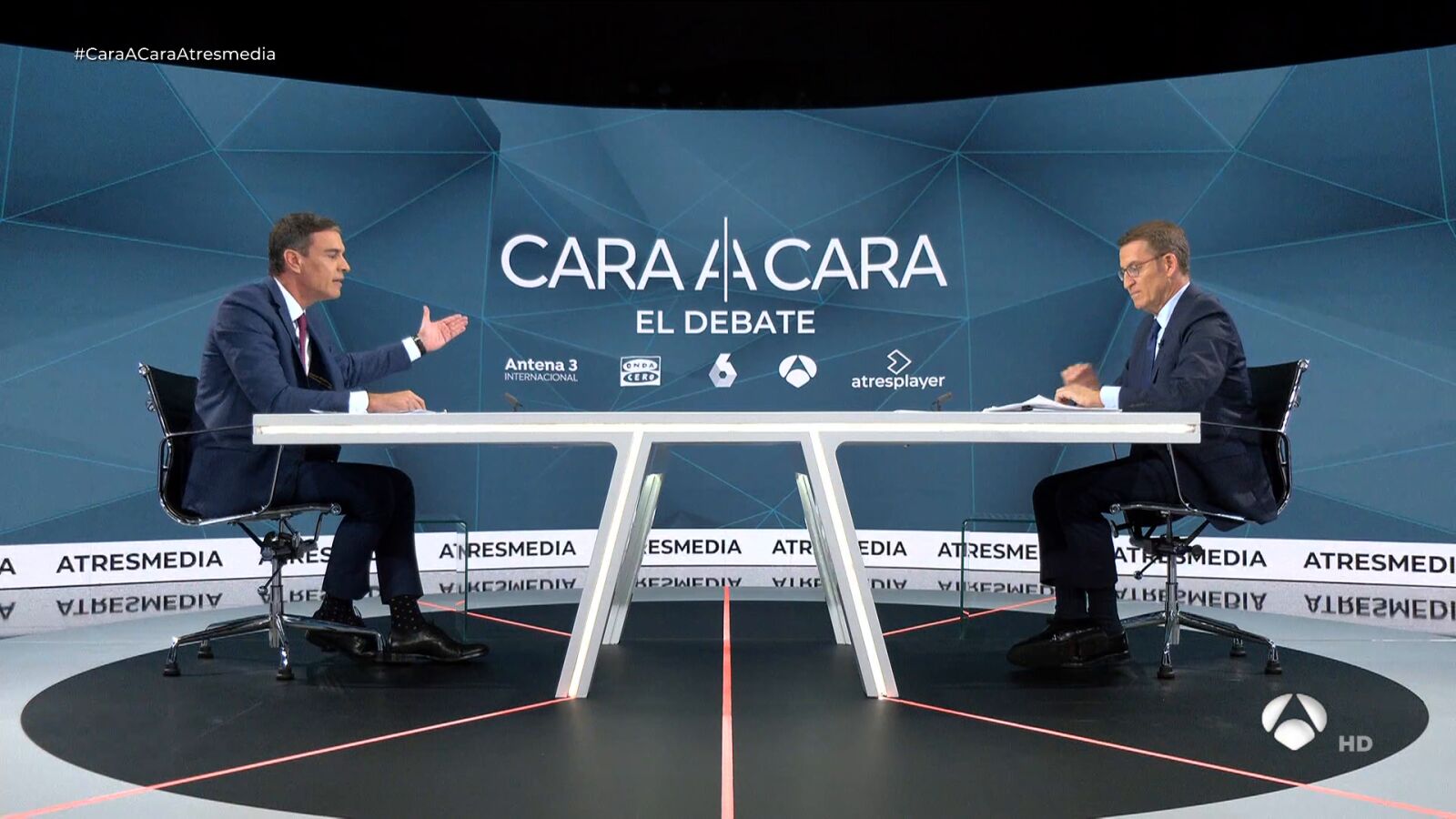 Feijóo ha lanzado esta oferta en el segundo bloque del debate organizado por Atresmedia sobre políticas sociales e igualdad, sin esperar al apartado de los pactos, aunque en el tercer bloque la ha reiterado varias veces. "Le traigo un pacto para clarificar este asunto", ha proclamado el presidente del PP, que ha firmado en directo un documento con ese compromiso de facilitar la investidura al más votado.