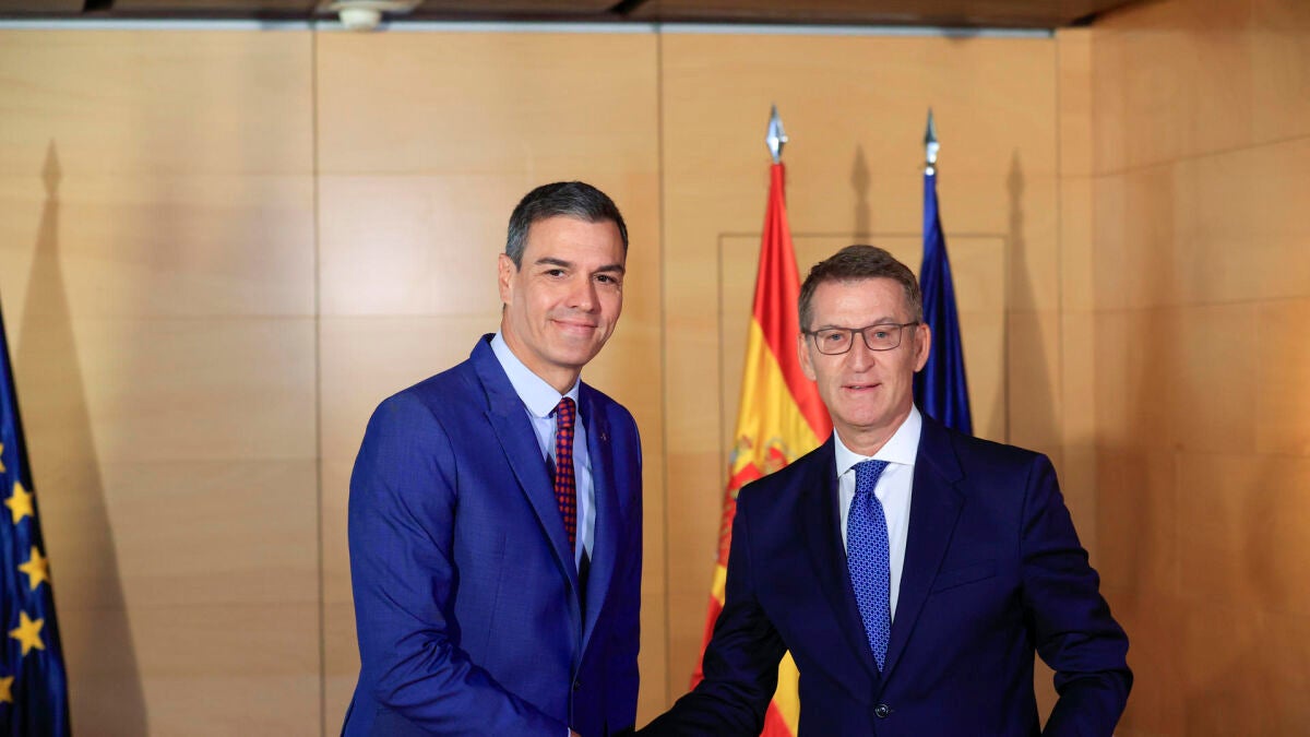 La cita se desarrolló en la misma estancia en la que se reunió la semana pasada con la vicepresidenta y líder de Sumar, Yolanda Díaz, aunque esta vez Sánchez y Feijóo estuvieron flanqueados por dos banderas de España y otras de la Unión Europea, en lugar de un par como la semana pasada.