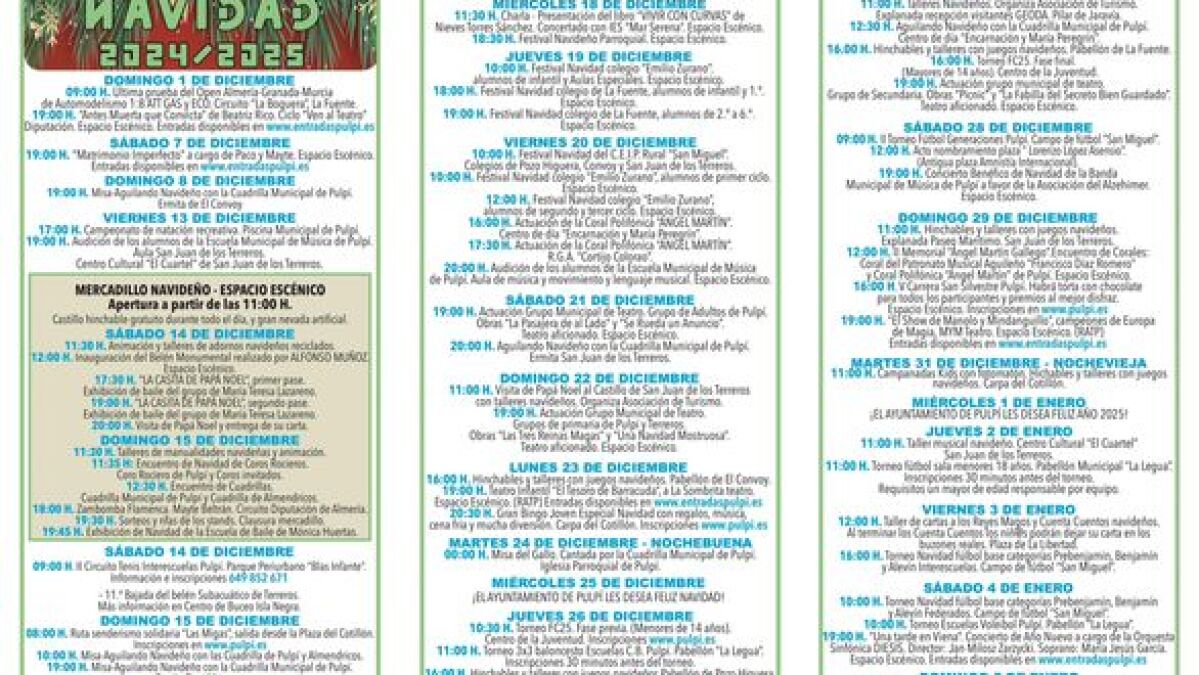 Este viernes, día 29, a las 18:30h en la Plaza de la Libertad de Pulpí, se procederá al Encendido del alumbrado navideño; un acto en el que también actuará Daniela Jiménez, finalista del I Concurso de Talentos "Almería Joven".