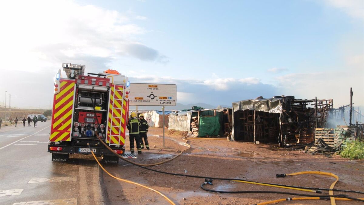 Un amplio dispositivo de Guardia Civil y Policía Local de Níjar permanecen desde esta mañana para efectuar el desalojo de los ocupantes del asentamiento. Muchos de ellos lo han abandonado durante el fin de semana mientras que otros han empezado a recoger sus pertenencias ante la entrada de la maquinaria de demolición.