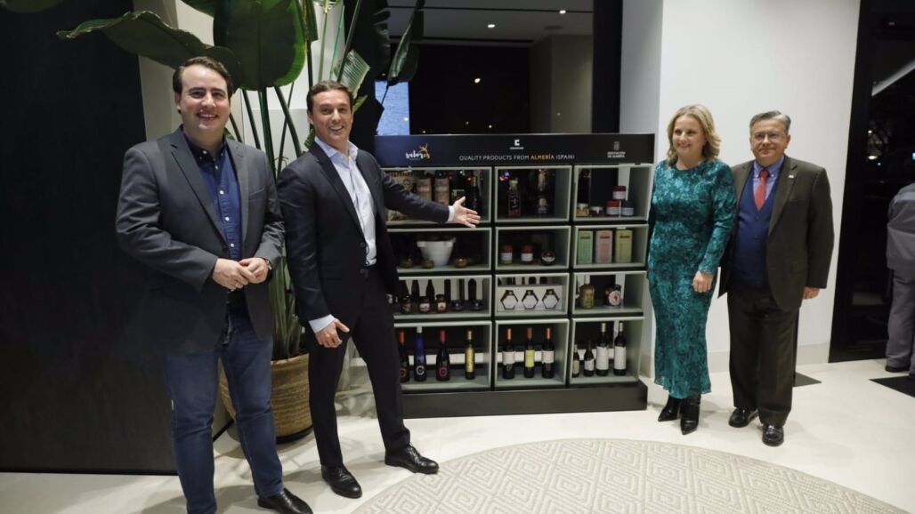 El presidente de la Diputación, Javier Aureliano García, y el vicepresidente de Comunicación de Cosentino, Santiago Alfonso, han participado junto al vicepresidente de Diputación, Fernando Giménez, la diputada de Promoción Agroalimentaria, María Luisa Cruz, y un nutrido de empresarios en la puesta de largo de este expositor con productos de la provincia que estará instalado en un espacio preferente de este centro de exposición y venta de la empresa almeriense.