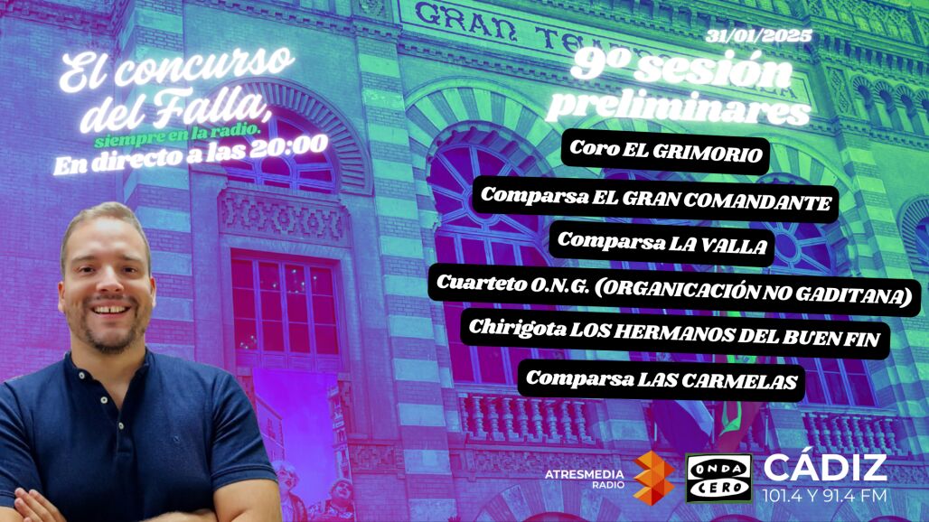 El Concurso Oficial de Agrupaciones del Carnaval de Cádiz afronta su novena sesión de preliminares con el regreso de la Chirigota del Bizcocho y la Comparsa de Marta Ortiz a las tablas del Gran Teatro Falla. Una sesión que comenzará a las 20h00 y que tendrá, a buen seguro, grandes momentos que podrás vivir en directo en Onda Cero Cádiz.