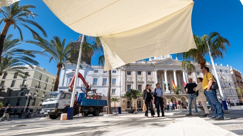 El Ayuntamiento de Cádiz ha comenzado este miércoles a colocar los nuevos toldos en la plaza San Juan de Dios sustituyendo a los anteriores que con el transcurso del tiempo se encontraban en un deficiente estado de conservación sin ofrecen la sombra necesaria. El alcalde de la ciudad, Bruno García, acompañado de la teniente de alcalde de Fiestas y Turismo, Beatriz Gandullo; y del teniente de alcalde de Mantenimiento Urbano, José Carlos Teruel; han supervisado esta mañana estos trabajos de instalación de los nuevos toldos que proporcionarán una mayor sombra.