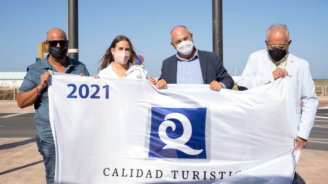 El delegado de Desarrollo Sostenible, Ignacio Bermejo, y la delegada de Desarrollo Turístico, Regla Moreno, acompañados del presidente de Asihtur, Antonio Víctor Páez, y del representante de la Federación de Asociaciones de Vecinos, Manuel Morejón, han izado hoy en la Playa de Camposoto la Bandera Q de Calidad Turística, un distintivo que se otorga cada año a los espacios que rozan la excelencia en todos sus servicios. El Ayuntamiento de San Fernando ha realizado durante las últimas temporadas una apuesta por la calidad en Camposoto, que este año ha alcanzado su gran transformación, y fruto de estos trabajos ha obtenido este distintivo, el único de calidad turística para playas de nuestro país.