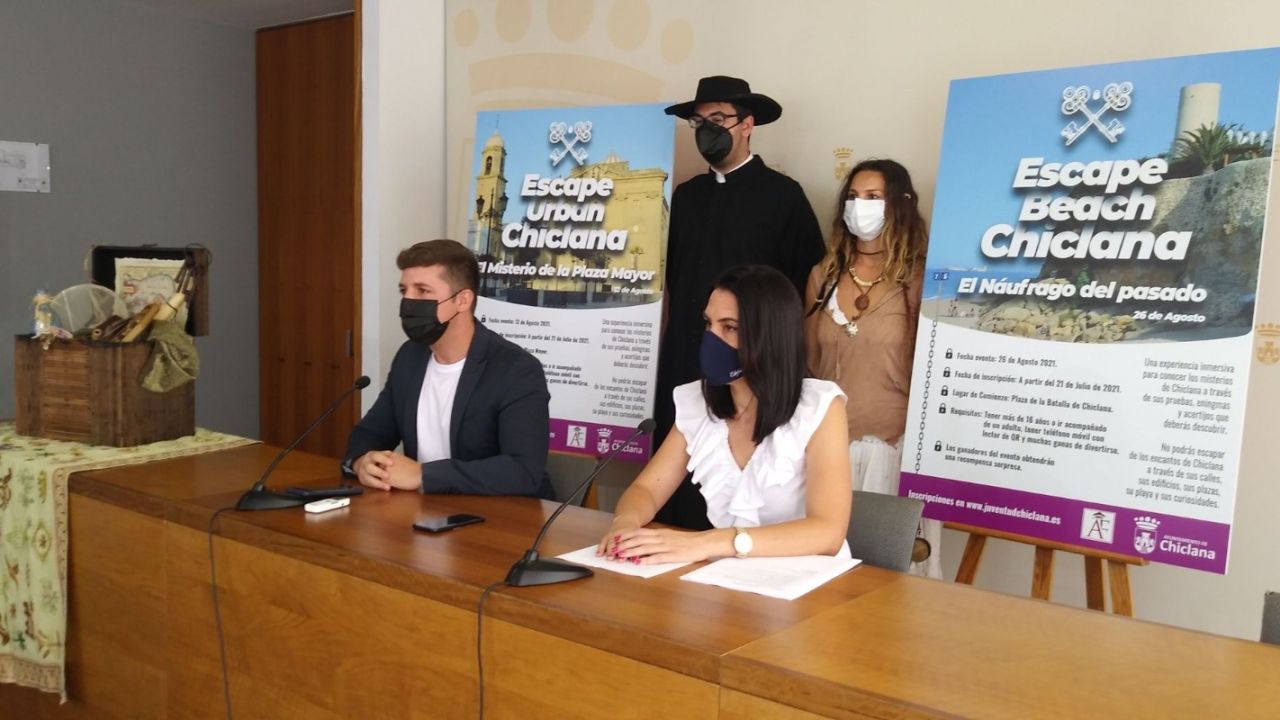 El delegado municipal de Juventud, José Alberto Cruz, acompañado por la directora de Althea Formación, Estefanía Pérez, ha presentado las iniciativas ‘Escape Urban Chiclana. El Misterio de la Plaza Mayor’ y ‘Escape Beach Chiclana. El Náufrago del pasado’, que se desarrollarán los días 12 y 26 de agosto respectivamente. “Se trata de unas actividades en las que se descubrirán nuestra ciudad de una forma muy divertida, con numerosas pruebas en diferentes emplazamientos emblemáticos”, ha indicado José Alberto Cruz, quien ha recalcado que “son actividades en las que podremos disfrutar de nuestros espacios públicos y peatonales, volviendo así a cuando jugábamos en la calle sin necesidad de estar pegado una pantalla”.
