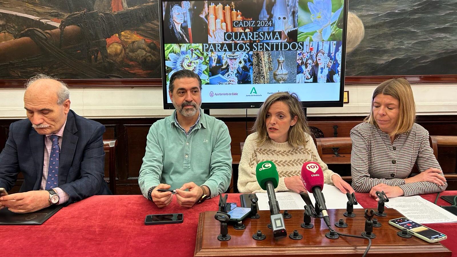 El Ayuntamiento de Cádiz, la Junta de Andalucía y la Fundación Cajasol han presentado de forma conjunta la programación de actividades que se llevará a cabo durante la Cuaresma como antesala de la llegada de la Semana Santa de 2024. El acto ha contado con la presencia de la teniente de alcalde de Cultura del Ayuntamiento gaditano, Maite González, el concejal de Hermandades y Cofradías, José Manuel Verdulla, la responsable de la Fundación Cajasol en Cádiz, Mar Díez, y el presidente del Consejo Local de Hermandades y Cofradías de Cádiz, Juan Carlos Jurado. La programación, que se ha presentado bajo el título ‘Cuaresma para los sentidos’ abarca una veintena de actividades que se desarrollarán en distintos espacios de la ciudad desde este martes 27 de febrero hasta el Domingo de Resurrección. Conciertos, actuaciones de bandas de música y agrupaciones musicales, exposiciones, conferencias o un pasacalles de más de 500 músicos son algunos de los atractivos de un programa de actos “más completo, más potente y que abarca a más disciplinas artísticas”, ha explicado la teniente de alcalde, Maite González.