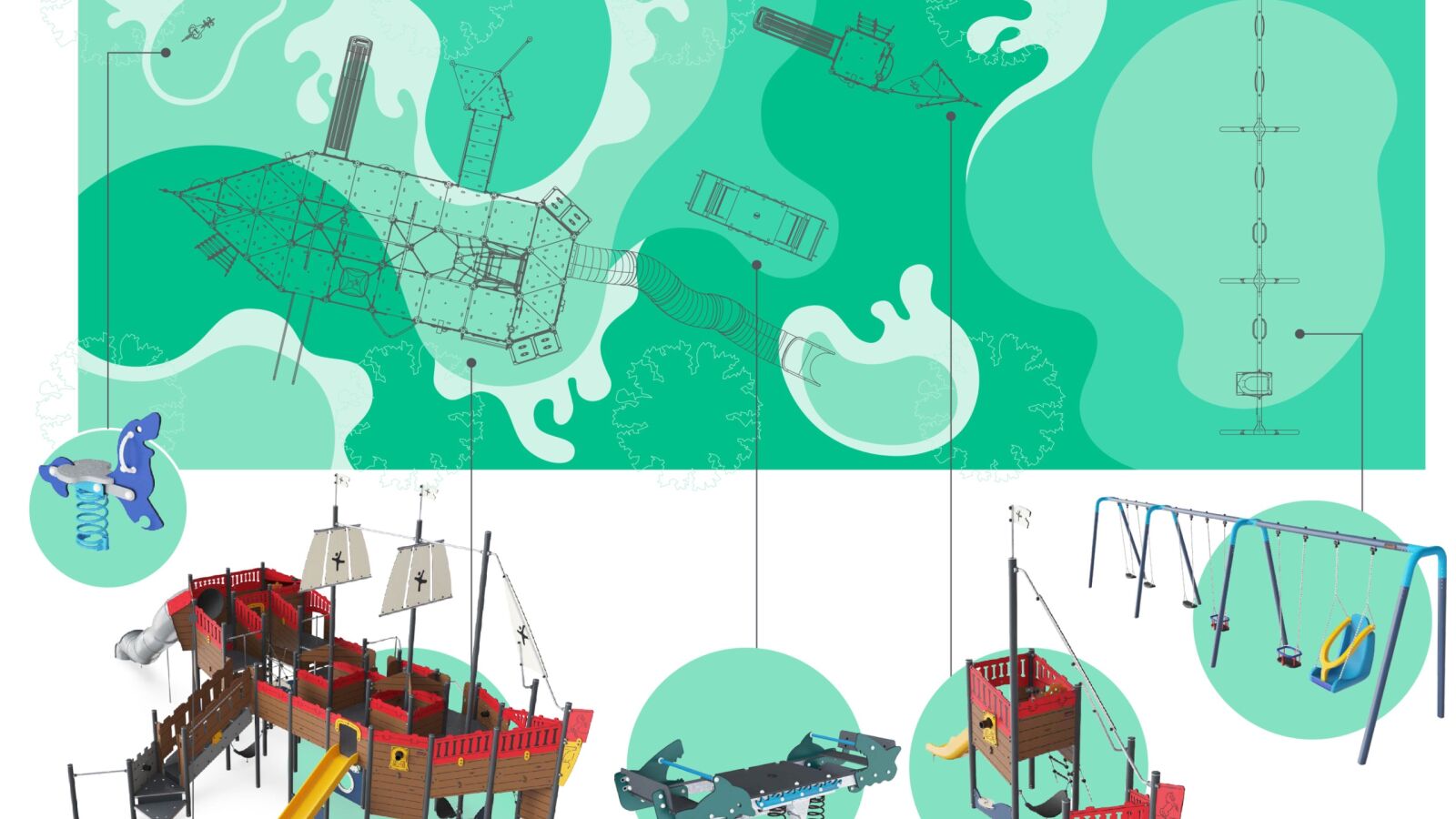 Por otro lado, un barco más pequeño tipo carabela formado por una variedad de juegos para todos los niños, como tobogán, prismáticos, escalera de cuerda, hamaca, ruedas giratorias, escritorio, con espacios para socializar y promover el sentido del equilibrio de los niños.