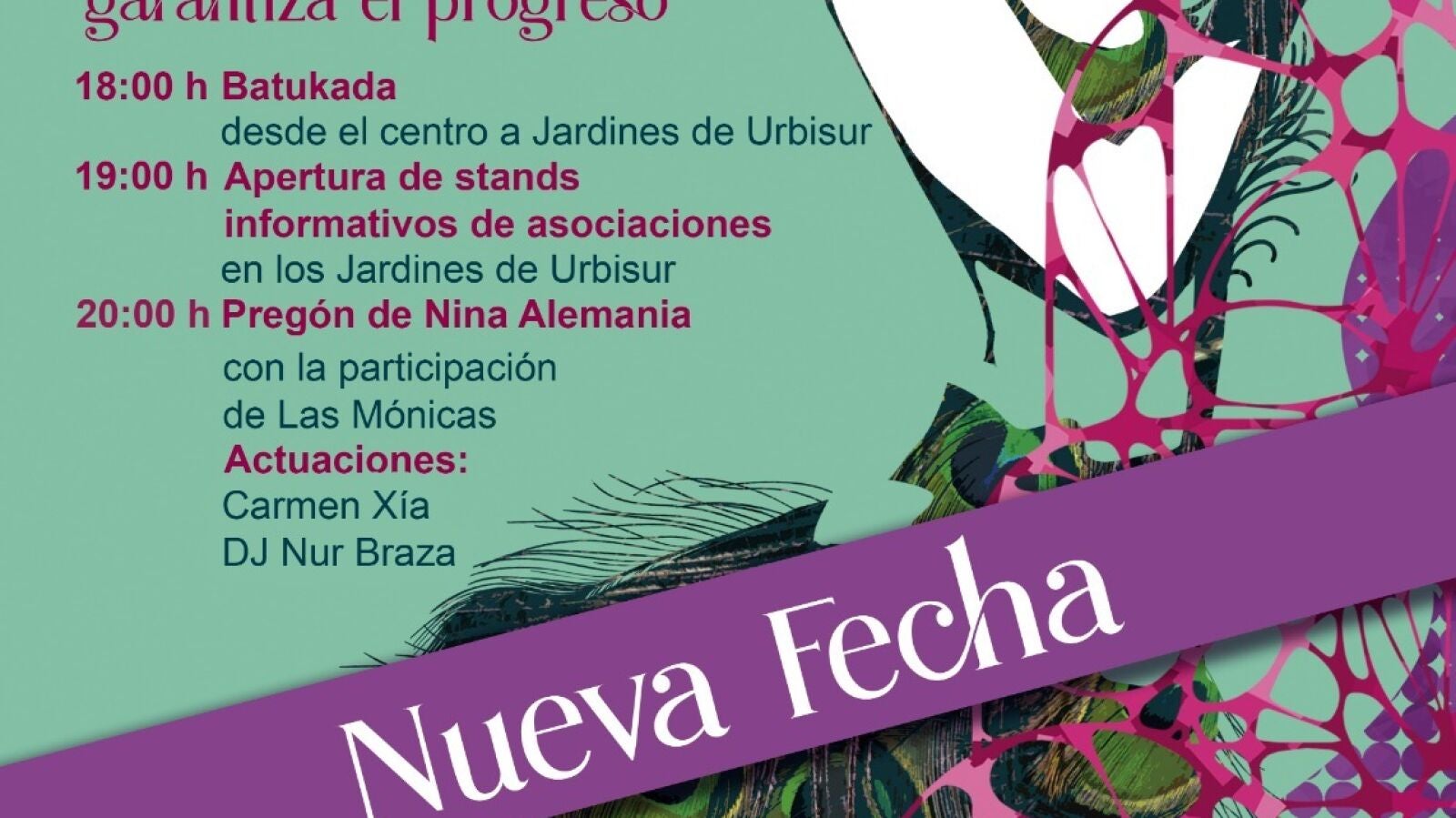 El acto festivo con motivo del Día Internacional de la Mujer ‘Invertir en igualdad garantiza el progreso’, que estaba previsto se celebrara el pasado 8 de marzo y que tuvo que aplazarse por la lluvia, finalmente se celebrará este viernes 12 de abril, a partir de las 20.00 horas, en los Jardines de Urbisur. Un evento que contará con el Pregón de la artista chiclanera Nina Alemania, que estará acompañada por el grupo Las Mónicas.