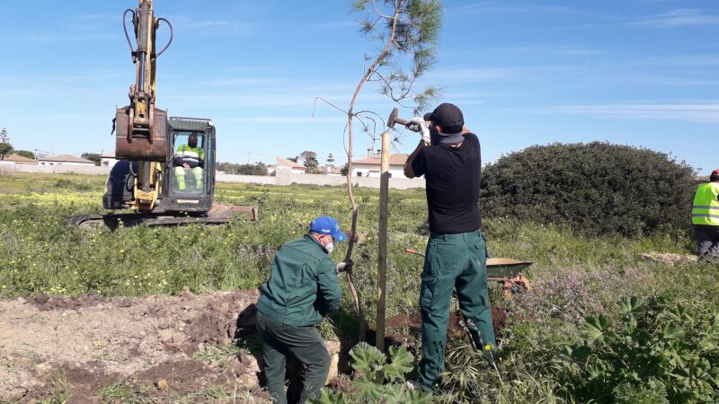 Dentro de los objetivos de la Agenda 2030 de lograr un municipio más sostenible, el Ayuntamiento de Chiclana continúa trabajando para ampliar la masa arbórea en el municipio. De esta forma, una de las apuestas municipales más importantes en esta materia se centra en el parque de la laguna de la Rana Verde, donde en la jornada de hoy ha comenzado la plantación de un total de 180 ejemplares de pino piñonero (pinus pinea). En este sentido, hay que destacar que esta acción que se desarrolla desde hoy se suma a la plantación de 82 acebuches en este mismo parque días atrás, complementándose en las próximas semanas con 75 nuevos árboles.