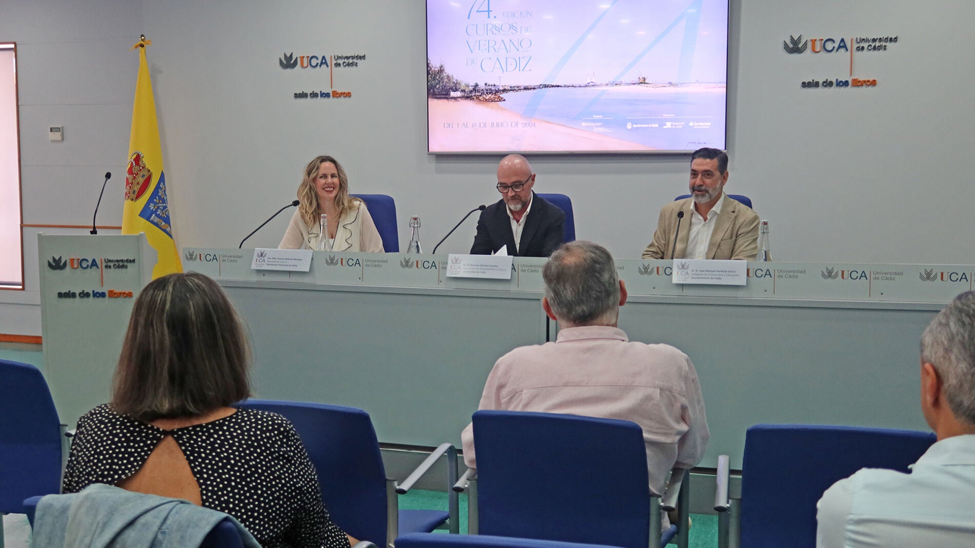 El vicerrector de Sostenibilidad y Cultura de la Universidad de Cádiz, Gonzalo Sánchez, junto al delegado de Universidad y Educación, Movilidad y concejal de Hermandades y Cofradías del Ayuntamiento de Cádiz, Juan Manuel Verdulla, y la diputada provincial de Cultura y Publicaciones, Vanesa Beltrán, ha presentado, en la sala de Los Libros del edificio Andrés Segovia, el programa y el cartel de los 74º Cursos de Verano de la UCA en Cádiz, que se desarrollarán entre el 1 y el 19 de julio. El servicio de Extensión Universitaria del Vicerrectorado de Sostenibilidad y Cultura de la Universidad de Cádiz, con el patrocinio del Ayuntamiento de Cádiz, Santander Universidades y Diputación Provincial de Cádiz, ha preparado 19 seminarios, de 25 horas de duración, más siete módulos desde la Escuela de Danza de la UCA y una agenda de eventos culturales que incluye conferencias, exposición fotográfica y conciertos.