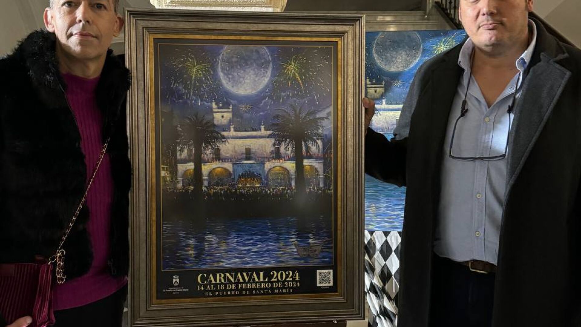 El teniente de alcalde de Fiestas, David Calleja, ha descubierto el cartel del Carnaval 2024 de El Puerto de Santa María, que se extenderá del 14 al 18 de febrero, junto al autor de la obra, Adrián Ferreras, en un acto que ha acogido el Palacio de Purullena, al que asistieron numerosos representantes de la Corporación, peñas y agrupaciones, representantes del Consejo Municipal del Carnaval, Asociación de Coquineras, coquineros 2023, amantes de la fiesta y muchísimas personalidades del mundo del carnaval.