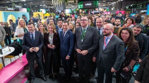 El presidente de la Junta de Andalucía, Juanma Moreno, junto al consejero de Turismo, Cultura y Deporte, Arturo Bernal, ha visitado el espacio destinado a Cádiz dentro del recinto andaluz y ha tenido la oportunidad de departir con la presidenta de la Diputación, Almudena Martínez, el vicepresidente cuarto y diputado de Turismo, Germán Beardo y el alcalde de Cádiz, Bruno García, entre otros representantes institucionales de la provincia.