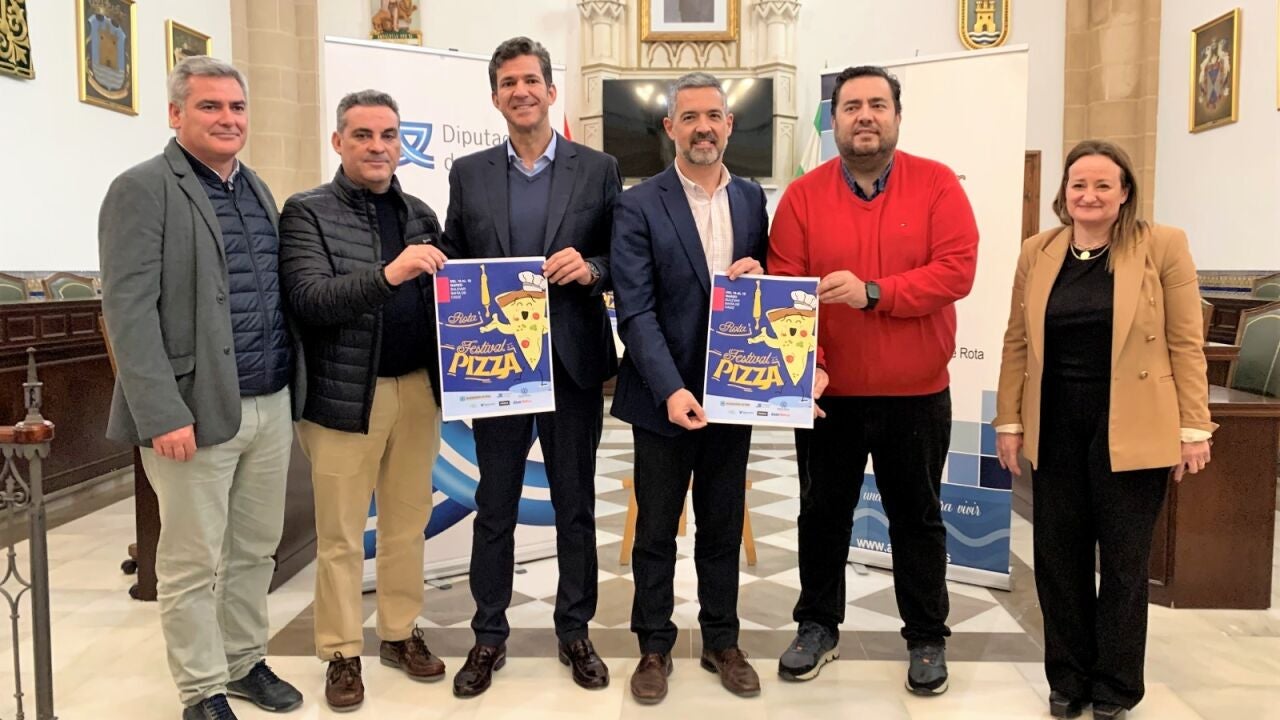 El alcalde de Rota, José Javier Ruiz, junto con el diputado del Área de Desarrollo de la Ciudadanía de la Diputación de Cádiz, Jaime Armario, han presentado lo que será el IV Festival de la Pizza de Rota, un evento gastronómico de lo más singular que llega precedido por el éxito de público de anteriores ediciones. La teniente de alcalde y diputada, Encarna Niño, ha querido iniciar su intervención señalando la apuesta del Ayuntamiento de Rota por este festival, así como el apoyo de la Diputación provincial a este evento gastronómico que en este año ve aumentado el número de empresas patrocinadoras, ya que Clash Diplo se ha sumado a Solera Motor y Makro.