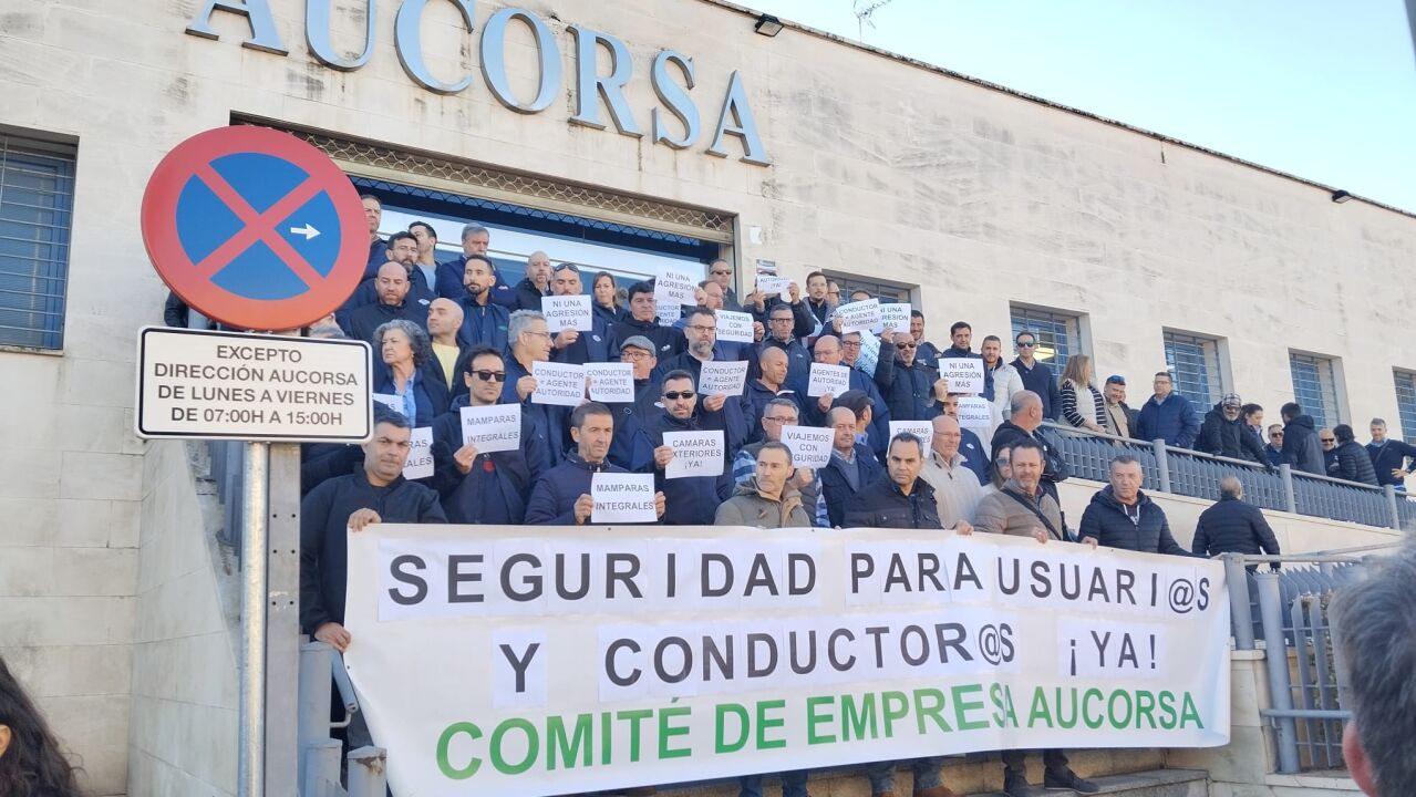 Los trabajadores de Aucorsa han protestado esta mañana en las puertas de su sede reclamando más medidas de seguridad, tras el intento de agresión de un conductor el pasado sábado.