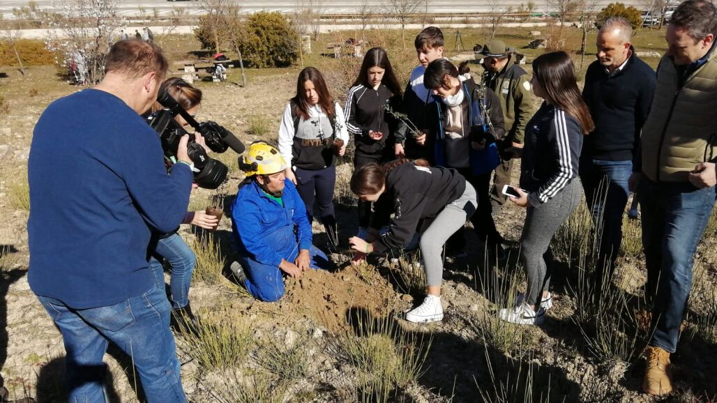 La actividad en el monte Santa Rita ha consistido en la reforestación de parte de la zona incendiada a través del voluntariado ambiental que presta el IES Sierra de Aras de Lucena, en el que han participado 100 alumnos de tercero de la ESO.