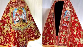 Esta prenda litúrgica de color rojo, con cordonería de oro, lentejuelas de oro y piedras preciosas en tisú de oro y sedas, ha sido sufragado por los devotos de San Fermín, y el sobrante de la recaudación de fondos se ha donado a Cáritas y a los refugiados de la guerra de Ucrania.