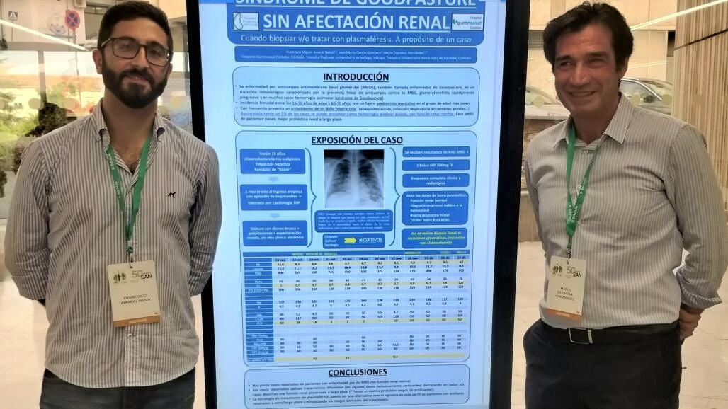 El doctor Amaral-Neiva ha explicado que este caso, presentado en el 50 Congreso de la Sociedad Andaluza de Nefrología junto al doctor Mario Espinosa, también especialista del servicio de Nefrología, se trata de una variante atípica de la “enfermedad por anticuerpos antimembrana basal glomerular (Ac-MBG)”, también conocida como “enfermedad de Goodpasture”, con una incidencia aproximada de 1 caso cada millón de habitantes. Particularmente, el caso diagnosticado en el Hospital Quirónsalud Córdoba se presentó como una variante atípica con una probabilidad de aparición de un caso por cada 10 millones de habitantes.