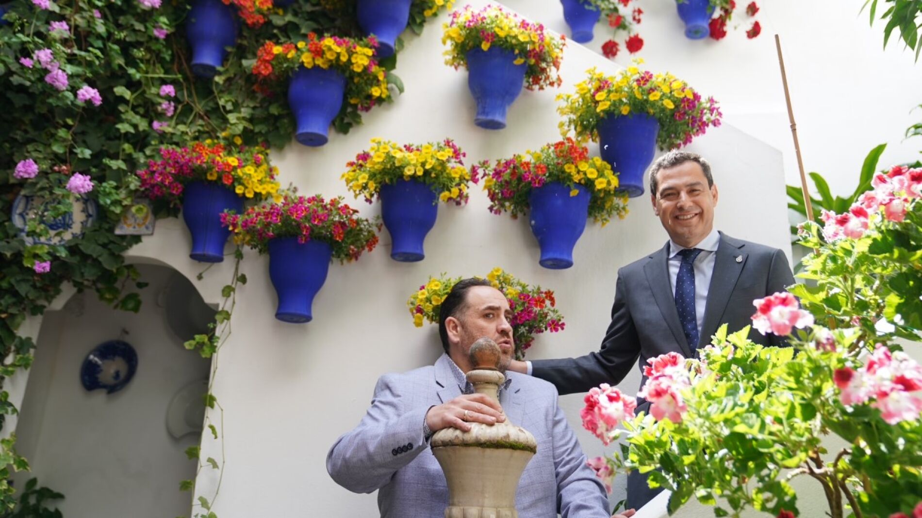 El presidente de la Junta de Andalucía, Juanma Moreno, ha visitado varios patios de Córdoba de los que ha dicho que se han convertido en un referente no sólo nacional, también internacional. Juanma Moreno se ha dirigido en primer lugar al patio de la calle Marroquíes, sede de la Asociación de Claveles y Gitanillas y ha conversado con su presidente, Rafael Barón. Ha visitado también los patios del Palacio de Viana que hoy celebra una jornada de puertas abiertas coincidiendo con el Festival de Patios de Córdoba.