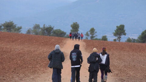 Coches, caravanas y camiones cruzan el paraje que conduce desde la "rave" hacia la autovía, varios kilómetros de camino, para abandonar la fiesta que se inició hace ya unas 140 horas.