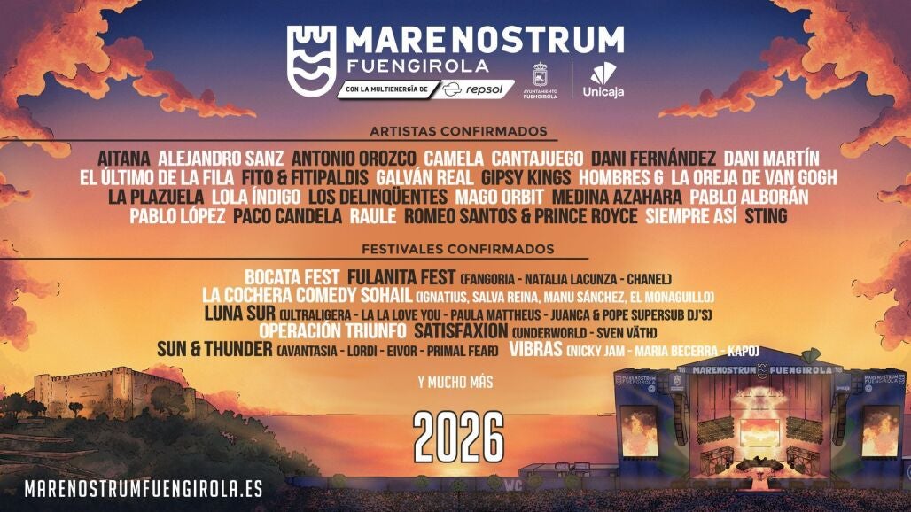 El cartel de 2026 reúne a algunas de las figuras más influyentes del panorama musical actual: Aitana, Alejandro Sanz, Sting, Lola Índigo, Antonio Orozco, Camela, Dani Fernández, Dani Martín, La Oreja de Van Gogh, Fito & Fitipaldis, Gipsy Kings, Hombres G, Medina Azahara, Pablo Alborán, Pablo López, Nicky Jam y Kapo, entre otros, consolidando a Marenostrum Fuengirola como uno de los festivales más ambiciosos y eclécticos de España y Europa.