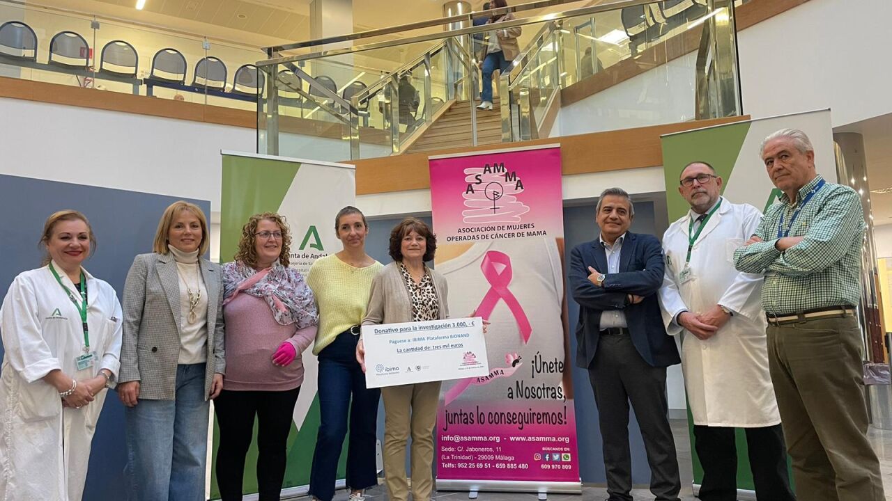 El Hospital Clínico Universitario Virgen de la Victoria ha celebrado esta mañana un acto de donación por parte de la asociación malagueña de mujeres operadas de cáncer de mama (ASAMMA) destinado a la investigación biomédica de esta enfermedad, y sus casos de recidiva. De este modo, el equipo de profesionalesliderado por el catedrático de la UMA y director de la unidad intercentros de Oncología Médica, Emilio Alba, ha recibido los fondos recaudados para el estudio de esta enfermedad, a través del Instituto de Investigación Biomédica de Málaga y Plataforma en Nanomedicina (IBIMA Plataforma BIONAND), por un importe de 3.000 euros, partida que irá destinada a un proyecto de investigación relacionado con el estudio genómico en cáncer de mama metastásico.