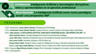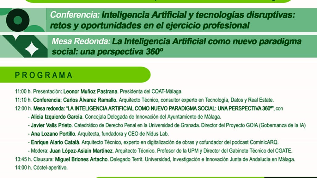 El Colegio Oficial de la Arquitectura Técnica de Málaga ha organizado la segunda sesión del Ciclo de Conferencias “Reflexiones Constructivas de la Arquitectura Técnica”, que tendrá lugar el día 28 de noviembre de 2025, viernes, a las 11:00h, en el salón de actos de la sede colegial de Málaga, y que en esta ocasión pondrá el foco en el universo de la innovación, la tecnología y la IA en el entorno profesional.