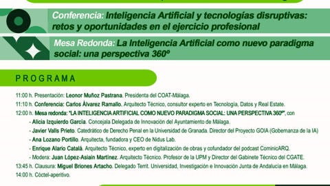 Tras la ponencia magistral se celebrará la mesa redonda ‘LA I.A. COMO NUEVO PARADIGMA SOCIAL: UNA PERSPECTIVA 360º’ en la que representantes de distintos ámbitos como Alicia Izquierdo, concejala de Innovación del Ayuntamiento de Málaga; el catedrático de la UGR y director del proyecto GOIA, Javier Valls; la fundadora de la startup digital Nidus Lab, Ana Lozano; o Enrique Alario, arquitecto técnico experto en aplicación de tecnologías en la dirección de obras, analizarán el impacto multidimensional de la IA, abordando las oportunidades y los desafíos que presenta para la sociedad desde sus respectivas ópticas. La mesa tiene como objetivo ayudar a comprender el rol de la tecnología como agente transformador de la sociedad, la economía y la cultura; debatir sobre las oportunidades y los riesgos que surgen con la adopción masiva de la IA en distintos sectores; analizar los aspectos éticos, legales y sociales cruciales para el desarrollo y la implementación responsable de la IA; y fomentar una visión crítica y constructiva sobre el futuro de la relación entre la inteligencia humana y la inteligencia artificial.