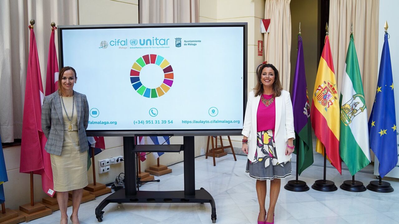 La concejala delegada de Participación Ciudadana, Mar Torres, junto a la directora de CIFAL Málaga, Silvia Candamil, ha informado esta mañana sobre este nuevo programa formativo sobre la difusión de los ODS, enfocados especialmente a la sostenibilidad medioambiental, y que también ofrece versiones en inglés y francés.