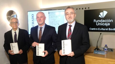 El responsable de Literatura de la Fundación Unicaja, Francisco Cañadas, y los investigadores Rafael Alarcón y Antonio Rodríguez Almodóvar han dado a conocer en el Centro Cultural Fundación Unicaja de Sevilla este hallazgo literario, enmarcado en la labor de divulgación de la Fundación Unicaja de su colección de manuscritos de los hermanos Machado.